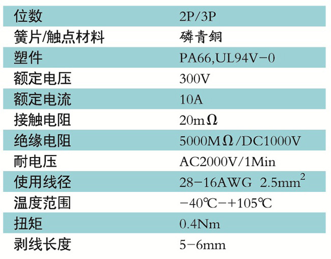 接線端子的絕緣材料用改性的尼龍(PA66),能達到或超過IEC947-7-1EN60947-7-1標準,阻燃等級達到UL94,V-0具有良好的電氣性能和機械性能。螺絲用高強度的鋼制成鍍鋅或鎳處理,導電體四方針用合金銅制成表面鍍錫,壓片采用彈性及極強的磷青銅表面鍍錫或鎳;壓線框用抗應力裂縫腐蝕的合金銅制成,這些金屬表面還鍍錫或鍍鎳加以保護。設計完全符合IEC60947-7-1.GB14048.7等標準。
