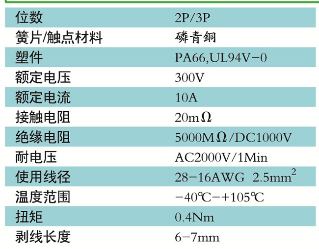接線端子的絕緣材料用改性的尼龍(PA66),能達(dá)到或超過IEC947-7-1EN60947-7-1標(biāo)準(zhǔn),阻燃等級達(dá)到UL94V-0具有良好的電氣性能和機(jī)械性能。螺絲用高強(qiáng)度的鋼制成鍍鋅或鎳處理,導(dǎo)電體四方針用合金銅制成表面鍍錫,壓片采用彈性及極強(qiáng)的磷青銅表面鍍錫或鎳;壓線框用抗應(yīng)力裂縫腐蝕的合金銅制成,這些金屬表面還鍍錫或鍍鎳加以保護(hù)。設(shè)計(jì)完全符合IEC60947-7-1.GB14048.7等標(biāo)準(zhǔn)。